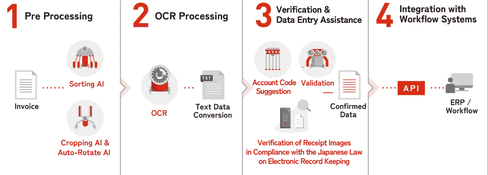 Our AI reads receipt details to accelerate data entry. Additionally, it enhances operational efficiency by verifying the consistency between subtotals, tax amounts, and total amounts, while also ensuring compliance with relevant regulatory requirements.